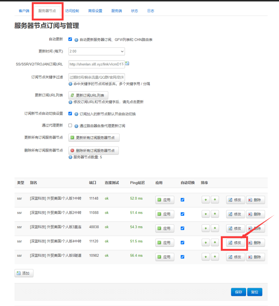 3.如果切换线路以后外网正常就不用继续看了,如果切换以后还是上不去要考虑是否到期,需要提供一下端口号,切换线路页面–点服务器节点–里面有多个线路随便选择一个点修改–里面的信息截图给我,就可以看到路由器对应端口是否到期了,参考下面图片