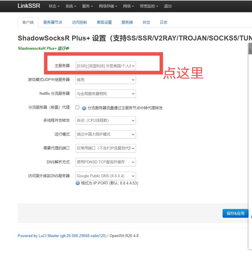 2.用户名不变,密码是admin或者password登录一下后台,进去以后点最上面的服务,点s开头的,到服务器配套页面,点主服务器会弹出多个服务器,根据情况选择一个服务器,点保存应用,等两分钟测试一下能否访问外网,如果不行可以继续切换,参考下图
